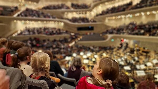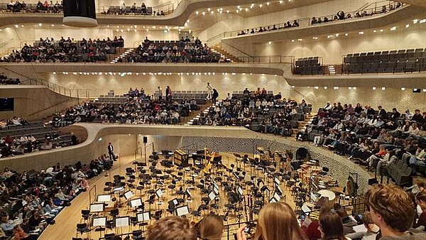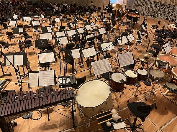 Danach sind wir in den großen Saal gekommen. Der erste Eindruck war wundervoll und überwältigend. Der Saal war eine Augenweide und sah fast wie ein Schloss aus. Er war riesig. Es standen ganz viele Instrumente auf der Bühne. Wir saßen hinter dem Orchester in der ersten und zweiten Reihe – tolle Plätze. Wir guckten auf Notenständer und auf die Schlaginstrumente. Es gab sehr viele Geigen und eine Harfe.