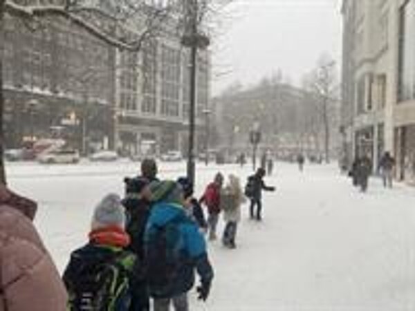 Es hat richtig doll geschneit, und viele Kinder haben die Schneeflocken weggeschnappt. Es war sehr windig, und die Schneeflocken sind ins Gesicht geflogen. Wir stapften wie Schneeleute durch die Winterstadt. Die Großen mochten den Schnee mehr oder weniger, haben auch damit gespielt und die Straßen für uns abgesperrt.